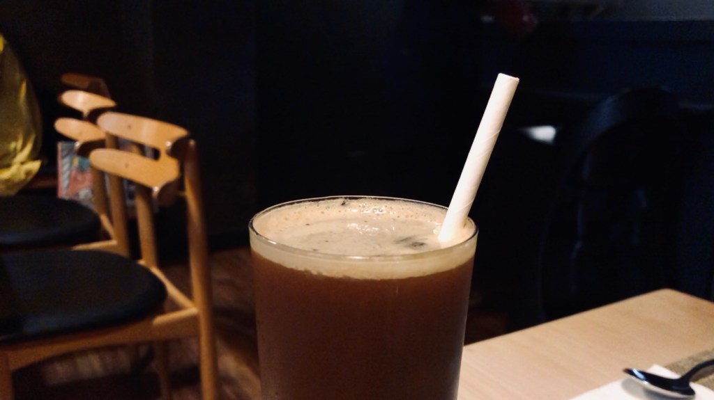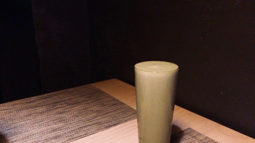 另一杯飲料是抹茶豆乳,少有的選了冰的版本(因為外面實在是太熱了)。跟想像中的深綠抹茶不一樣,上來是一杯透著白、看起來就很軟綿的飲品。要形容顏色的話,大概就是莫蘭迪色系中的淺青色,類似霧面薄荷綠、曖曖內含光的感覺(喂)。比起看起來略濃厚的外表,它的口感扎實卻不至於難吸(有喝過那種很ㄍㄡˊ的飲料吸到上顎感覺要被吸進去的應該就能體會我在說什麼),每一口都充滿豆乳香和抹茶味(甜度的部分我忘記了,請原諒偶的金魚腦)。