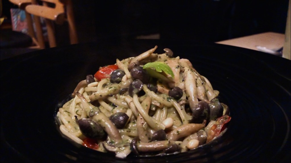 喝著喝著,我們的主餐也上來了(磨刀霍霍)。首先是法式堅果青醬義大利麵,上來的時候還冒著熱煙(看照片)。用叉子攪拌了之後,發現裡面有很多配料,尤其是滿滿的菇。麵條也很有彈性但不會太有嚼勁,是介於義大利麵的極度彈牙與台式小吃的軟任麵條之間的口感。